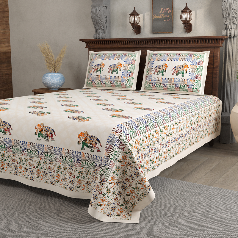 HAND BLOCK PRINT Bedsheet with 2 Pillow Cover Bedroom Home Decor Elephant Bedsheet Cotton Double Indian Design Bedsheet For Cotton Bedsheet
